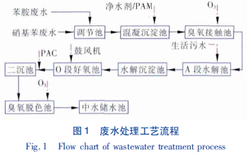 苯(ben)胺、硝基苯(ben)綜合廢(fei)水(shui)(shui)(shui)中含(han)有大量難降解有機物,COD值較高(gao),可(ke)生(sheng)化(hua)(hua)性極(ji)差(一般(ban)B/C值為0~0.1),屬(shu)于高(gao)含(han)鹽廢(fei)水(shui)(shui)(shui),因此綜合考慮多(duo)種因素,決定采用物化(hua)(hua)與(yu)生(sheng)化(hua)(hua)處(chu)理(li)(li)相結合的工藝。以混凝沉淀和臭氧氧化(hua)(hua)作為預(yu)處(chu)理(li)(li)單元,不會提高(gao)廢(fei)水(shui)(shui)(shui)的含(han)鹽量,但可(ke)以提高(gao)廢(fei)水(shui)(shui)(shui)的可(ke)生(sheng)化(hua)(hua)性,使A/O生(sheng)物系統(tong)處(chu)理(li)(li)效(xiao)率大幅(fu)提高(gao);在末端再進行臭氧氧化(hua)(hua)脫色處(chu)理(li)(li)可(ke)確保出水(shui)(shui)(shui)色度達標。工藝流程見圖1。
