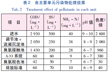 本(ben)工程經(jing)過近2個月的調試運行后(hou),出水水質穩定,COD總去除率為98.6%,達到設計要(yao)求。各單元(yuan)的處(chu)理效果見表2。