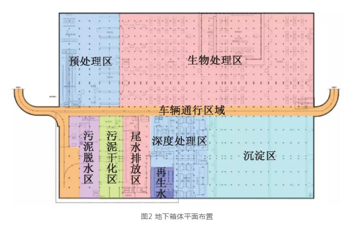 本工程的耐火等級定為一級,地下箱體中的生物反應池、二沉池等池頂操作層構筑物區域的防火分區面積按工藝要求確定,其中的水面面積不計入相應防火分區的允許建筑面積。