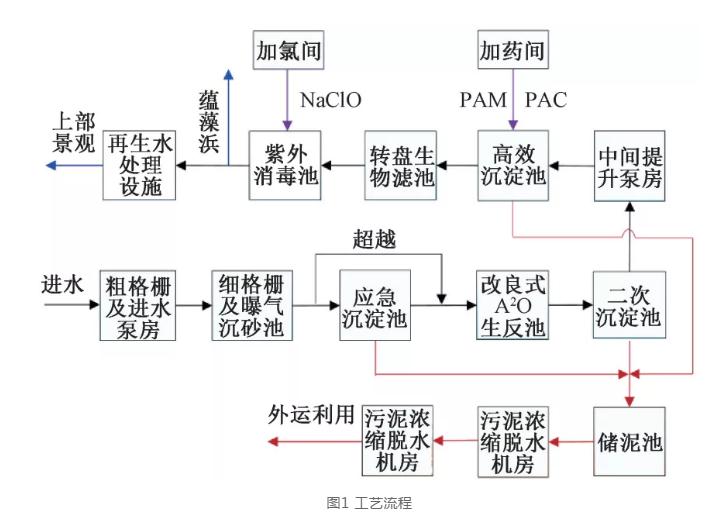 南翔污水處理廠總占地面積11.32hm²,總處理規模15萬m³/d,其中一期工程采用全地下建設模式,處理規模5萬m³/d(土建按10萬m³/d建設),其工藝流程如圖1所示。出水標準為《城鎮污水處理廠污染物排放標準》(GB18918-2002)一級A標準,部分出水滿足《地表水環境質量標準》(GB3838-2002)娛樂性水景類景觀用水標準。地下箱體占地約3hm²,其平面布置圖如圖2所示。