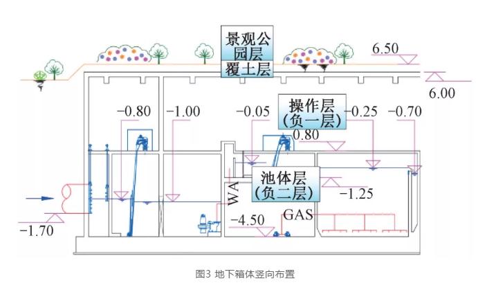 地下箱體在豎向空間布置上分為四層,由上至下分別為景觀公園層、覆土層、操作層(負一層)及池體層(負二層),其豎向布置如圖3所示。景觀公園層為開放式的景觀綠地和休閑公園;覆土層根據景觀公園功能設計及植被對土層厚度的要求覆土,厚度約10m;操作層以生產和輔助用房為主,承擔巡檢功能;池體層以處理構筑物和管廊為主,承擔處理功能。