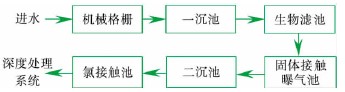 某石化公司廠前區生活(huo)(huo)污水(shui)匯集(ji)后由(you)污水(shui)管(guan)線自(zi)(zi)流(liu)(liu)進(jin)入生活(huo)(huo)污水(shui)處(chu)理(li)裝置(zhi),首先通(tong)過機械格柵進(jin)入沉(chen)砂池(chi)(chi)(chi),由(you)一級(ji)螺(luo)旋(xuan)泵(beng)提升,進(jin)入一沉(chen)池(chi)(chi)(chi),出水(shui)自(zi)(zi)流(liu)(liu)進(jin)入生物(wu)濾池(chi)(chi)(chi),由(you)旋(xuan)轉布水(shui)器均勻分配。生物(wu)濾池(chi)(chi)(chi)出水(shui)通(tong)過二(er)(er)級(ji)螺(luo)旋(xuan)泵(beng)提升至固(gu)體(ti)接(jie)(jie)觸曝(pu)氣(qi)池(chi)(chi)(chi),處(chu)理(li)后自(zi)(zi)流(liu)(liu)進(jin)入二(er)(er)沉(chen)池(chi)(chi)(chi),二(er)(er)沉(chen)池(chi)(chi)(chi)活(huo)(huo)性污泥由(you)三級(ji)螺(luo)旋(xuan)泵(beng)提升回流(liu)(liu)至固(gu)體(ti)接(jie)(jie)觸曝(pu)氣(qi)池(chi)(chi)(chi),二(er)(er)沉(chen)池(chi)(chi)(chi)出水(shui)流(liu)(liu)經氯(lv)接(jie)(jie)觸池(chi)(chi)(chi)后,自(zi)(zi)流(liu)(liu)進(jin)入生活(huo)(huo)污水(shui)深度處(chu)理(li)系統,生活(huo)(huo)污水(shui)處(chu)理(li)裝置(zhi)工藝流(liu)(liu)程見(jian)圖2。
