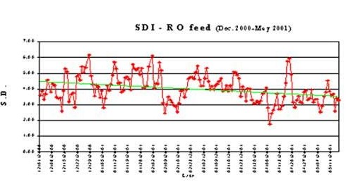 原工業用水(shui)有時SDI值(>6)及TSS(6-6.5ppm)很高(gao),這偶爾導(dao)致RO給(gei)水(shui)的(de)SDI值超過 4 。