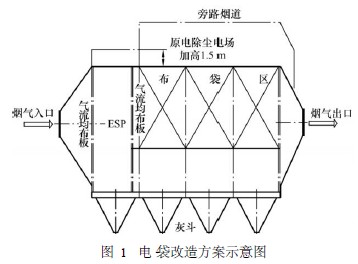 淮南洛(luo)河發電(dian)(dian)(dian)廠2號機組是(shi)國產300MW亞臨界(jie)燃煤(mei)發電(dian)(dian)(dian)機組,于(yu)1986年投產發電(dian)(dian)(dian),其高(gao)壓(ya)靜電(dian)(dian)(dian)除(chu)(chu)塵(chen)器由(you)長(chang)春電(dian)(dian)(dian)力煤(mei)場(chang)機械研究(jiu)所設計、長(chang)春發電(dian)(dian)(dian)設備(bei)修造(zao)廠制造(zao),臥式(shi)干型雙(shuang)室四(si)電(dian)(dian)(dian)場(chang),設計除(chu)(chu)塵(chen)效率(lv)(lv)99%。因設備(bei)使(shi)用(yong)年限已久(jiu),設計除(chu)(chu)塵(chen)效率(lv)(lv)偏低,雖(sui)(sui)然在 2001年進行(xing)(xing)了(le)局部改造(zao),但仍無法滿足環(huan)保(bao)(bao)要(yao)求。根據國家環(huan)保(bao)(bao)總局頒(ban)布的新《火電(dian)(dian)(dian)廠大氣(qi)污染物排(pai)放標準(zhun)》(GB 13223—2003)第Ⅱ時段和第Ⅲ時段要(yao)求:到(dao)2010年1月1日火電(dian)(dian)(dian)廠煙塵(chen)最高(gao)允許排(pai)放濃度要(yao)達到(dao)50 mg/m3。在結(jie)合(he)(he)現(xian)場(chang)的實際情(qing)況及綜(zong)合(he)(he)考慮工程投入和運行(xing)(xing)費(fei)用(yong)的基礎上(shang),決定(ding)對原電(dian)(dian)(dian)除(chu)(chu)塵(chen)進行(xing)(xing)全面改造(zao),采用(yong)電(dian)(dian)(dian)2袋組合(he)(he)除(chu)(chu)塵(chen)方式(shi)。雖(sui)(sui)然電(dian)(dian)(dian)2袋組合(he)(he)式(shi)除(chu)(chu)塵(chen)技術(shu)在國內300 MW 及以上(shang)機組尚無應(ying)用(yong)先例,但已在200 MW 機組上(shang)成功應(ying)用(yong),技術(shu)上(shang)已經成熟,電(dian)(dian)(dian)2袋改造(zao)方案(an)示意圖(tu)(tu)如(ru)圖(tu)(tu)1所示。