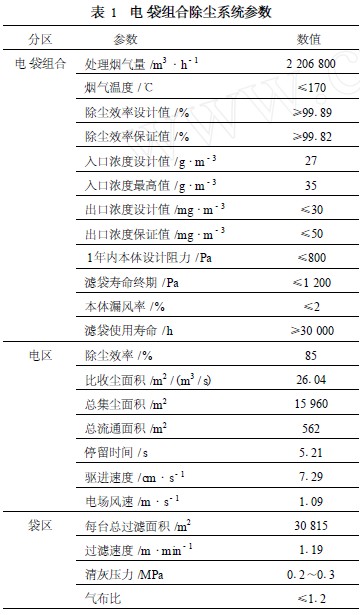 電2袋組合除(chu)塵(chen)系統(tong)參數見表1。