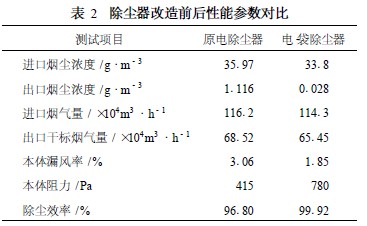系統改造于2008年5月10日竣工(gong)并投入運行(xing), 為了確認(ren)改造效(xiao)果,洛河發電(dian)廠(chang)請權威部門在工(gong)況(kuang)基本(ben)相似的前提下對改造前后除(chu)塵器進(jin)出口煙氣的主要(yao)參數(shu)(shu)進(jin)行(xing)了測試,除(chu)塵器改造前后性能參數(shu)(shu)對比具(ju)體數(shu)(shu)據見(jian)表(biao)2 (以(yi)一側為例) 。