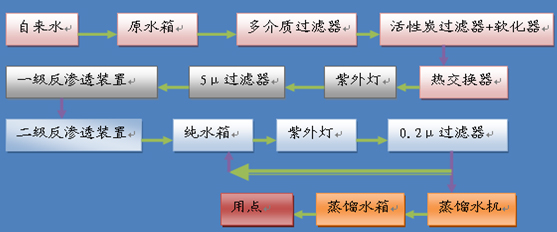 該工程是針對上海某制藥有限公司蒸餾注射用水開發的新工藝。結合我司近十年除鹽水系統成功的設計、生產經驗,關鍵部件全部進口,完全能夠滿足客戶的要求,并能長期安全可靠運行。純化水系統采用先進的“二級反滲透脫鹽”水處理工藝。蒸餾水機利用純化水為原料,多效蒸餾,確保出水水質到達藥典注射水標準。