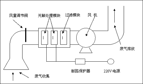 三、惡臭氣體利用排風設備輸入到本凈化設備后,凈化設備運用高能UV紫外線光束及臭氧對惡臭氣體進行協同分解氧化反應,使惡臭氣體物質其降解轉化成低分子化合物、水和二氧化碳,再通過排風管道排出室外。