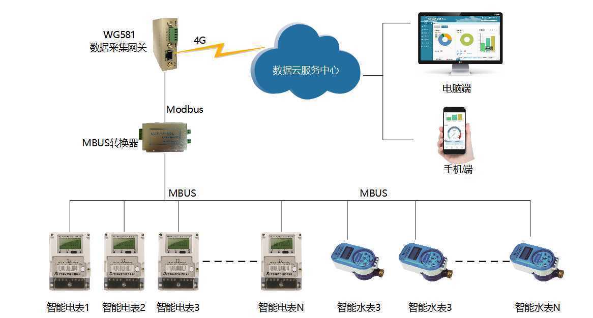 電表采集網(wang)關,通過串口與電表(基于(yu)modbus系列或電表645或水表協議)物理連接,采集儀表的數據,在網關上進行邊緣計算,數據標準化以后以MQTT的json串的格式,通過4G網絡上網,傳到分布式數據云平臺,通過電腦端或手機端,實時監控或控制。