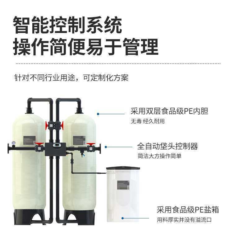 軟(ruan)化水(shui)裝(zhuang)置即降(jiang)低水(shui)硬度的設備,主要除祛水(shui)中(zhong)的鈣(gai)、鎂(mei)離(li)子,在進水(shui)為深井(jing)水(shui)或者水(shui)源硬度很大的情況下(xia),其作用是(shi)去除水(shui)中(zhong)的鈣(gai)、鎂(mei)離(li)子含量,使水(shui)中(zhong)鈣(gai)鎂(mei)離(li)子減(jian)少,包括(kuo)三部分(fen),即離(li)子交換(huan)部分(fen)、鹽再生部分(fen)和控制部分(fen)。