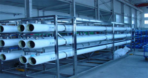 原水―→多介質過濾器―→活性炭―→軟化―→一級RO―→二級RO。樹脂軟化器加上兩級反滲透,處理水量50T/H。