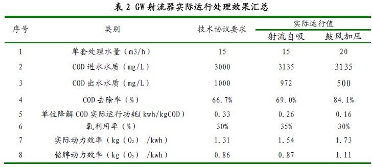 (2)GW 射流曝氣與微孔曝氣相比,噪音、能耗大大降低,每降解1kgCOD 的實際能耗僅為0.26kwh;
