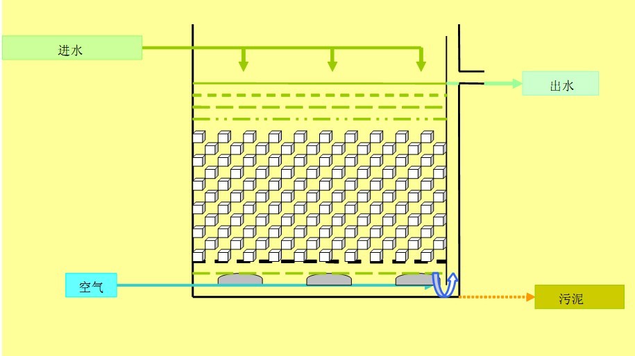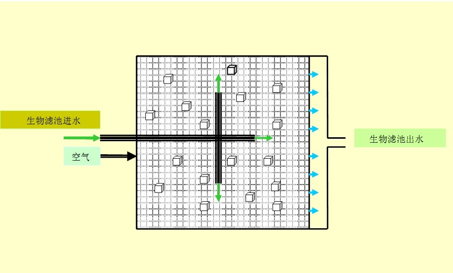 從(cong)處理(li)系統前(qian)端過來的(de)污水(shui)以逆流的(de)方向(xiang)從(cong)上方進(jin)入(ru)到生物(wu)濾(lv)池(chi)中并均勻布水(shui),經過曝(pu)氣濾(lv)床和篩板(在反應(ying)池(chi)底部)后從(cong)濾(lv)池(chi)壁引入(ru)到反應(ying)池(chi)的(de)上部,然后離(li)開(kai)濾(lv)池(chi)。