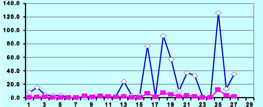 下面這張圖顯示的是使用LEVAPOR生物濾池中降解雙酚-A(BPA)的效果分析,其中藍色表示進水,紅色表示出水,橫軸是時間(天),縱軸是濃度。