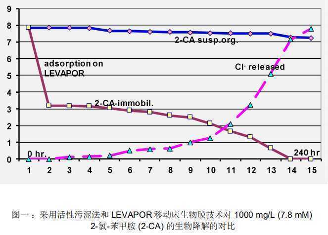 采用活性污泥法微生物菌群被2-氯-苯甲胺所抑制。而采用LEVAPOR移動床生物膜技術2-氯-苯甲胺在2個小時內被吸附到載體上,液相中的毒性大幅降低,從而確保生化降解能夠迅速啟動。10天內2-氯-苯甲胺被降解,以氯離子的釋放來表征生化降解的效果。這個機理說明采用LEVAPOR生物膜載體比使用其它類型的載體工程啟動更快,降解能力更強。