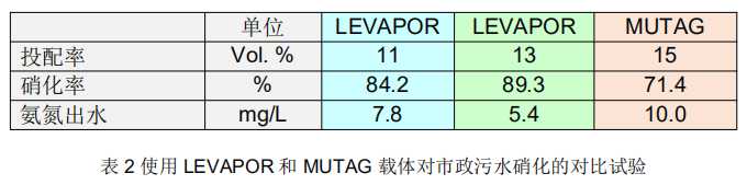 該市政污水廠的處理量從43000m3/d增加到58000m3/d,為了提高硝化效率實施了中試,對LEVAPOR載體和MUTAG載體進行了對比試驗。LEVAPOR載體即使在低投配率的條件下硝化效率也比MUTAG載體高,氨氮的出水值更低。