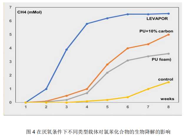 在厭氧環境下對氯苯化合物的生物降解實驗中對不同類型的載體對微生物的繁殖及生物膜的形成做了比較研究。甲烷的產生量作為反應速度的表征。在聚氨酯泡沫體上3-4周后開始產生甲烷氣體,而在LEVAPOR載體上同一時間段甲烷氣體的產生量已達到最大量的85%左右(圖4)。