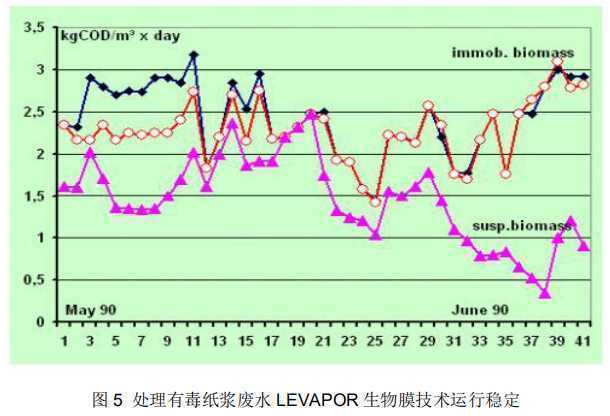中試項目長時間運行的結果顯示在LEVAPOR投配率12%時厭氧處理有毒紙漿廢水的反應器的容積可以從原來的65000立方米(UASB厭氧罐)減少到18000立方米(生物膜反應器)。