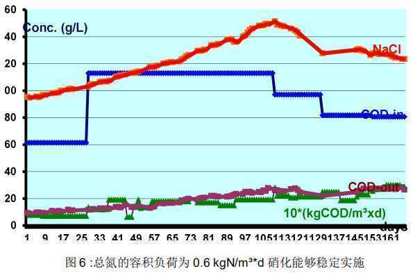 一個化工廠的已建污水處理設施需要對氨氮也做生化處理。為完成該目標可以有不同的技術選項。因為空間受限沒有辦法對污水設施進行擴建。考慮硝化的生物動力學,在總氮的容積負荷大于0.6kgTKN/m3×d時,在反應池中投放一定量的LEVAPOR載體,可以建立穩定和有效的硝化流程。經過連續運行驗證了該方案確實可行(圖6)。