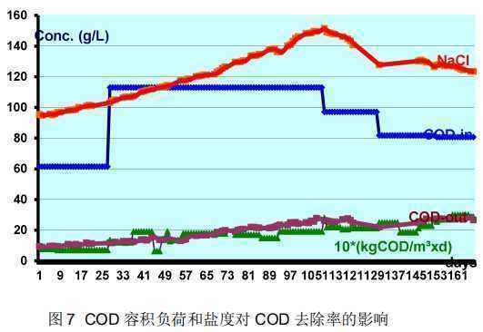 在鹽度達到120g/L和COD容積負荷2.0-2.5kgCOD/m3×d的條件下COD去除率能夠達到70-75%。