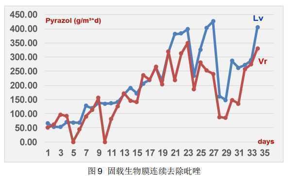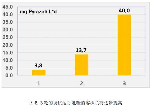 馴化過的固載微生物作為接種劑放入1.4m3的中試裝置中,逐步增加容積負荷,4-5個禮拜后就能達到300mg吡唑/L×d的去除速度(圖9)。