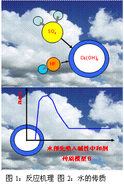 在半(ban)干法煙氣(qi)(qi)處理時,氣(qi)(qi)相中(zhong)的(de)(de)酸性(xing)氣(qi)(qi)體先被吸(xi)附(fu)在堿(jian)性(xing)吸(xi)附(fu)劑的(de)(de)表面(mian),然后進(jin)行中(zhong)和反(fan)應。從工程反(fan)應動力學角度(du),氣(qi)(qi)相中(zhong)的(de)(de)水蒸氣(qi)(qi)的(de)(de)存在會有效促進(jin)反(fan)應。但是氣(qi)(qi)態的(de)(de)水分子并不直接(jie)起作用(yong),而是通過在堿(jian)性(xing)中(zhong)合劑表面(mian)形成的(de)(de)“水膜(mo)”,參見圖(tu)1。
