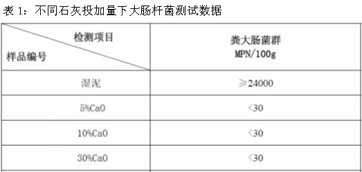 濕污泥仍然還有大量微生物和細菌。污泥處理處置近來得到重視,但污泥的衛生學意義上的無害化討論較少。石灰處理可以有效地殺菌,保證了后續儲存、運輸上的衛生學要求。表1為不同石灰投加量下的殺菌效果。結果顯示,優化的運行條件下,少量的石灰投加量(如5%)就可以滿足殺菌的要求。