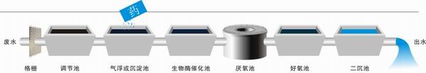 污水經斜篩攔截雜質后自流入調節池進行水質、水量的均衡調整,出水至氣浮池或沉淀池進一步去除廢水中的懸浮物,出水至生物酶催化池,經酶促反應后,進入厭氧處理系統,出水進入好氧生物處理系統,處理后進入二沉池,進行泥水分禽后,達標排放或車間回用。