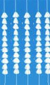改型軟性填料采用紡搓地纖維繩串連壓有纖維絲均勻分布地塑料圓片,組成一定長度地單元纖維束,(詳見填料表示法)。改變和克服了原來的中心繩散絲打結、抗拉力不均勻、運轉時易斷、纖維絲在水中難以橫向展開、分布不勻、偏向、生物膜結團、實際比表面積低、使用壽命短等弊病。經有關部門測定,改型后的軟性填料比原來的利用率提高一倍。