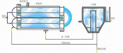 氧化溝由多條封閉的溝組成,建成環狀,大量的微生物隨污水在其中循環流動,從前一系統進入的原水迅速被溝內的水流稀釋,混合并隨之流動。這種溝型具備推流式和完全混合式的雙重特點。工藝設計上取消了初沉池,氧化溝內有機物徹底降解并發生硝化反應;如果沿環形池水流方向改變曝氣強度,可形成缺氧段,進行反硝化反應;加長污泥泥齡,可取消污泥消化池,簡化污泥的處理工藝;加大二沉池,保證泥水分離效果;在氧化溝前加設厭氧池,可達到除磷的要求。氧化溝出水進入二沉池進行泥水分離,微生物沉淀到池底,一部分回流入氧化溝,另一部分進入儲泥池進行污泥處理,上清液通過溢流堰出水,經過消毒后,出水可達到相關標準。