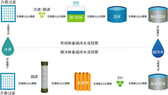 傳(chuan)統與高(gao)科(ke)技膜(mo)法(fa)制(zhi)備超(chao)純水處理(li)流程比較