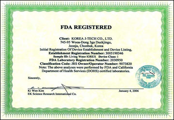 IOREX水處理器已獲得韓國專利、美國專利、中國專利、俄羅斯國家標準、韓國ISO9001:2000認證、美國FDA認證、中國生活飲用水檢測報告、國家鍋檢報告。