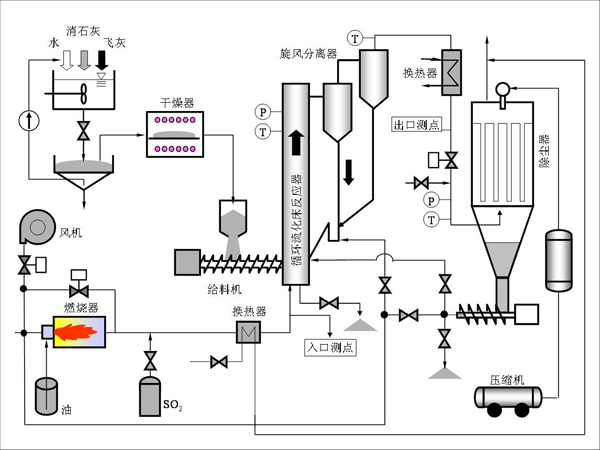 脫硫通過水合鈣基脫硫劑在反應器內的循環實現,脫硝通過向反應器內噴入氨完成,并可同時脫除煙氣中的氯等腐蝕性氣體和砷、硒等有害痕量元素。