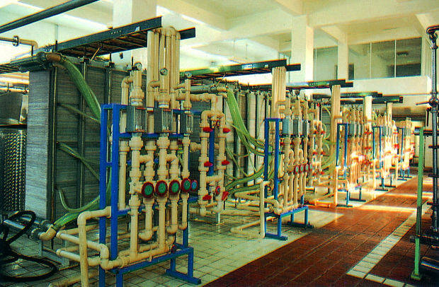 電滲析是將水(shui)置于直(zhi)流電場中(zhong)(zhong),使水(shui)中(zhong)(zhong)的(de)(de)離子(zi)發(fa)生定向遷(qian)(qian)移,同時(shi)利(li)用陽、陰離子(zi)交換(huan)(huan)膜對(dui)陽陰離子(zi)的(de)(de)選擇透過(guo)性(xing),使離子(zi)遷(qian)(qian)移,達到離子(zi)與水(shui)分離的(de)(de)目的(de)(de)。作為(wei)預脫鹽(yan)的(de)(de)手段(duan)置放于離子(zi)交換(huan)(huan)系統之前,可延(yan)長離子(zi)交換(huan)(huan)系統的(de)(de)再生周期。本設備特(te)點(dian)為(wei):其(qi)能(neng)耗低、產水(shui)量大、脫鹽(yan)率高、穩定性(xing)強。