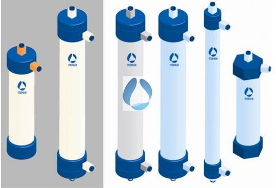 中空纖維柱式膜組件,最大膜通量為7000~8000L/h支。(該值為膜面積為35m2的膜組件的設計純水通量)。中空纖維柱式膜件采用錯流過濾技術,抗污染性極佳,使用壽命為普通組件2-5倍。主要用途:污水深度處理,再生回用,工業純化水生產,生物醫藥領域細菌及活性物質的濃縮、脫除或分離,果汁濃縮,茶飲料澄清,中藥提取液的過濾和精制,發酵液的除菌過濾等。