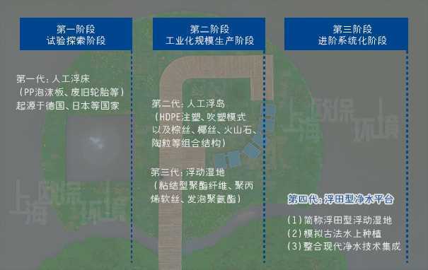 人工浮島按照使用材料和時間的不同分為:分為試驗探索階段、規模生產工業化階段、進階系統化階段,目前新一代ZIPBIO-C201517復合纖維浮動濕地型人工浮島,由上海歐保環境科技研發生產。