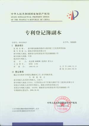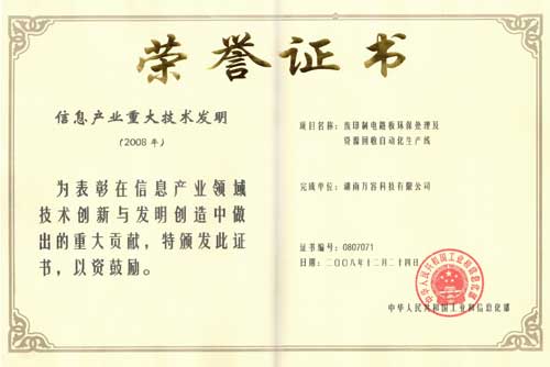 2008年12月份,以該專利技術設備為核心的“廢印制電路板環保處理及資源回收自動化生產線”項目榮獲“2008年國家信息產業重大技術發明”獎,成為我省歷史上第二家獲得該項重大國家獎勵的企業。在本次獲獎的8個項目的承擔單位中,我們發現,中國移動、普天通信、清華大學、浙江大學等“中字頭”央企或國內頂尖高校赫然在列。