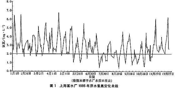上海某水廠從黃浦江下游取水,1995年其原水氨氮變化如圖1所示。從圖中可以看出,該廠原水氨氮污染較嚴重,很多時間在2mg/L以上,最高可達6~7mg/L,用如此污染狀況的原水生產自來水,需重視氨氮對飲用水水質的影響。