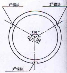 本工程池體水平向預應力束采用三點同步張拉,每區段絞線束所對應的中心角為120°(如圖4-1所示)。