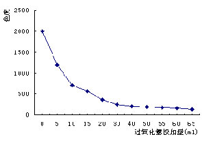 從實驗結果可以看出,當采用過氧化氫作為氧化劑進行脫色時,實驗曲線坡度較小,隨著過氧化氫投加量的增大,廢水的色度逐漸下降,當投加量大于50ml時,廢水的色度下降不是很明顯,曲線變得比較平滑。此時污水色度降至200左右,其去除率為90%。