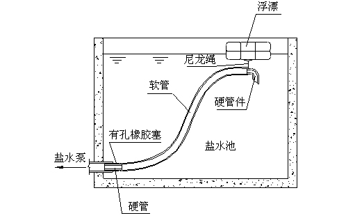 為了消(xiao)除鹽(yan)(yan)(yan)(yan)水(shui)池(chi)靜(jing)(jing)壓強(qiang)對鹽(yan)(yan)(yan)(yan)水(shui)泵(beng)出口(kou)(kou)壓頭的(de)(de)影響,筆者設計了一套保持鹽(yan)(yan)(yan)(yan)水(shui)泵(beng)入(ru)口(kou)(kou)壓強(qiang)恒定裝置如圖2:制(zhi)作一個(ge)浮漂(piao),用尼龍繩將一根軟(ruan)(ruan)管(guan)(guan)(guan)的(de)(de)一端吊掛在浮漂(piao)的(de)(de)下方,軟(ruan)(ruan)管(guan)(guan)(guan)的(de)(de)另一端固(gu)結在鹽(yan)(yan)(yan)(yan)水(shui)池(chi)出口(kou)(kou)處(注意(yi)軟(ruan)(ruan)管(guan)(guan)(guan)與鹽(yan)(yan)(yan)(yan)水(shui)池(chi)出口(kou)(kou)的(de)(de)接口(kou)(kou)處不能泄露,軟(ruan)(ruan)管(guan)(guan)(guan)最(zui)好(hao)選(xuan)用內置鋼(gang)絲螺旋支架(jia)的(de)(de)塑料管(guan)(guan)(guan)以防抽癟。安裝軟(ruan)(ruan)管(guan)(guan)(guan)時,注意(yi)不要(yao)因(yin)為安裝了軟(ruan)(ruan)管(guan)(guan)(guan)及其管(guan)(guan)(guan)件而(er)使(shi)鹽(yan)(yan)(yan)(yan)水(shui)泵(beng)入(ru)口(kou)(kou)管(guan)(guan)(guan)徑變(bian)得太小和造(zao)成太大(da)的(de)(de)管(guan)(guan)(guan)路阻(zu)力,注意(yi)不要(yao)有浮漂(piao)的(de)(de)零部件被鹽(yan)(yan)(yan)(yan)水(shui)泵(beng)吸(xi)入(ru))。由(you)于軟(ruan)(ruan)管(guan)(guan)(guan)的(de)(de)上端(鹽(yan)(yan)(yan)(yan)水(shui)泵(beng)入(ru)口(kou)(kou))在浮漂(piao)的(de)(de)作用下能保持與鹽(yan)(yan)(yan)(yan)水(shui)液面的(de)(de)距離不變(bian),從而(er)消(xiao)除了鹽(yan)(yan)(yan)(yan)水(shui)池(chi)靜(jing)(jing)壓強(qiang)對交換器內鹽(yan)(yan)(yan)(yan)水(shui)線速度的(de)(de)影響。