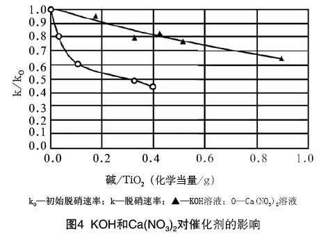 分別將催化劑浸漬在KOH和Ca(NO3)2液體中,在350℃的條件下進行脫硝實驗。得到這兩種物質對催化劑的影響(見圖4)。