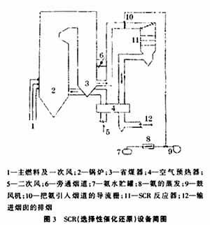 圖3示出選擇性催化還原(SCR)脫硝系統。向煙氣噴注氨或氨水,接著氨和NOX在設于催化器內的料層表面上進行催化還原反應,把NOX還原成N2和水蒸汽(H2O)。最佳反應溫度為350℃至400℃,脫硝效率極高,一般可達80%至90%甚至更高。鍋爐負荷降低時,把小股煙氣通過“旁通”煙道輸進催化器,以提升煙溫,保證催化器進口需求溫度。多數把催化器設于省煤器和空預器之間,如圖3所示,稱為“熱側”(Hot-side)或“高塵”(High-dust)型SCR系統。對于配用“熱”電除塵(電除塵器裝在空預器前)鍋爐,因煙氣已經過除塵,飛灰低,催化器裝在電除塵器與空預器之間,這種系統稱“低塵”(Low-dust)型SCR系統。對于配用除硫裝置的鍋爐催化器總是裝在除硫設備之后,稱為“末端”(Tail-end)或“冷側”(Cold-side)型SCR系統。這種系統要求另增燃料(或用其它方式)對煙氣實施二次加熱把煙溫提升到需求值。為節省工程費用,一般采用“高塵”型SCR系統。
