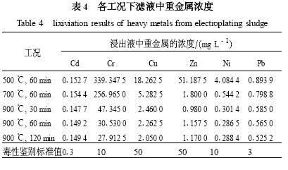 本文對(dui)不同(tong)氣氛情況(kuang)下不同(tong)工況(kuang)電鍍污(wu)泥(ni)在管式爐(lu)內的(de)(de)焚燒(shao)灰渣作(zuo)了(le)進一(yi)步探討(tao),研究了(le)溫度和焚燒(shao)時間對(dui)電鍍污(wu)泥(ni)中(zhong)(zhong)重(zhong)金屬的(de)(de)浸(jin)出(chu)特(te)性的(de)(de)影響(xiang).表4 是對(dui)5 種工況(kuang)下的(de)(de)焚燒(shao)灰渣的(de)(de)浸(jin)出(chu)液的(de)(de)測(ce)定結(jie)果,浸(jin)出(chu)液中(zhong)(zhong)Cd、Cu、Ni 、Pb 的(de)(de)濃(nong)度都明顯低于國家浸(jin)出(chu)毒性鑒別標準值.