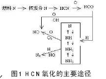 NOx的生成機制,大致有以下規律:(1)在一般的燃燒條件下,燃料中的氮有機物首先被分解成HCN、NH和CN等中間產物,它們隨揮發分一起從燃料中析出,稱之為揮發分N,揮發分N析出后仍殘留在焦炭中的氮有機物,稱之為焦炭N;(2)揮發分N中最主要的是HCN和NH;(3)揮發分N中HCN氧化的主要途徑如圖1所示。