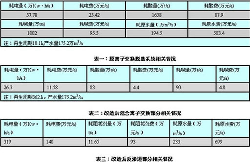 對同一種原(yuan)水(shui),離子交換(huan)(huan)脫(tuo)鹽系(xi)統(tong)(tong)與反滲(shen)透(tou)+混合(he)(he)離子交換(huan)(huan)脫(tuo)鹽系(xi)統(tong)(tong)的制水(shui)成(cheng)(cheng)本(ben)是(shi)不同的。該(gai)公司自(zi)備電廠(chang)原(yuan)離子交換(huan)(huan)脫(tuo)鹽系(xi)統(tong)(tong)為(wei)(wei)復床(強酸氫型(xing)陽離子交換(huan)(huan)器+強堿氫氧型(xing)陰(yin)離子交換(huan)(huan)器)+混合(he)(he)離子交換(huan)(huan)器,產(chan)水(shui)能力(li)為(wei)(wei)200m3/h,系(xi)統(tong)(tong)進(jin)水(shui)含(han)鹽量為(wei)(wei)630mg/L。2001年(nian)10月引入反滲(shen)透(tou)技術,形成(cheng)(cheng)反滲(shen)透(tou)+混合(he)(he)離子交換(huan)(huan)脫(tuo)鹽系(xi)統(tong)(tong)。現將系(xi)統(tong)(tong)改造(zao)前(qian)后相關運行情況及制水(shui)成(cheng)(cheng)本(ben)分別列于表1,表2,表3(表中物(wu)料的價格(ge)以(yi)32%的HCl530元(yuan)(yuan)/t,31%的燒堿530元(yuan)(yuan)/t,電費(fei)0.44元(yuan)(yuan)/(kW•h),原(yuan)水(shui)3元(yuan)(yuan)/m3,阻垢劑8萬元(yuan)(yuan)/t計)。