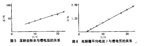普通電解槽采用與活性炭固定床電解槽相同的電極材料、極板尺寸和極距,經試驗得到苯酚去除率與槽電壓關系、平均電流與槽電壓關系。