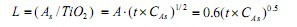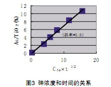 飽合層的厚度為oc(時間×砷的濃度)1/2 ,所以 Loc As/TiO2=A·(t×CAs ) 1/2 其中:t—反應時間;CAs —砷的濃度;KAs —砷沉積的速率。以橫軸為(CAs ×t)1/2 ,縱軸為As/TiO2作砷濃度隨時間的變化圖(如圖3)。