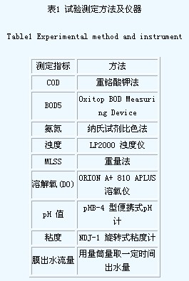 試驗對COD、BOD5、氨氮、濁(zhuo)度、MLSS、DO、pH、粘度等運行參數進(jin)行了(le)測定,方法及所用儀(yi)器見表1。