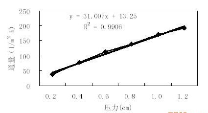 清(qing)水(shui)(shui)通(tong)(tong)量(liang)實驗(yan)用(yong)水(shui)(shui)為(wei)自來水(shui)(shui)。由圖(tu)3 可(ke)(ke)以(yi)看出,PET 膜(mo)在(zai)(zai)(zai)低壓力下就有著很(hen)(hen)大的(de)(de)通(tong)(tong)量(liang),在(zai)(zai)(zai)H △ =0.2cm時,膜(mo)通(tong)(tong)量(liang)是(shi)37L/m2·h;當H △ 增加到1.0cm 時,膜(mo)通(tong)(tong)量(liang)更是(shi)達(da)到170L/m2·h。另外,從圖(tu)3 可(ke)(ke)以(yi)看到一(yi)個有意思的(de)(de)現象(xiang),清(qing)水(shui)(shui)通(tong)(tong)量(liang)曲線在(zai)(zai)(zai)y 軸的(de)(de)截距(ju)并不是(shi)零(ling),而是(shi)大于零(ling)。范彬[7]也(ye)發現了這(zhe)個截距(ju)不為(wei)零(ling)的(de)(de)現象(xiang),但是(shi)他的(de)(de)結論(lun)是(shi)小于零(ling),他分(fen)析(xi)認為(wei)是(shi)膜(mo)材(cai)料(liao)尼龍篩絹的(de)(de)疏水(shui)(shui)性(xing)所(suo)(suo)致。本實驗(yan)所(suo)(suo)用(yong)實驗(yan)材(cai)料(liao)也(ye)是(shi)疏水(shui)(shui)性(xing)的(de)(de)PET 高(gao)聚物[10],但為(wei)什(shen)么卻有著相(xiang)反的(de)(de)結果呢?筆者認為(wei),從圖(tu)1 的(de)(de)顯(xian)微鏡照片(pian)可(ke)(ke)以(yi)看出,膜(mo)的(de)(de)單根(gen)編織線是(shi)由很(hen)(hen)多(duo)細(xi)絲(si)(si)組成(cheng),在(zai)(zai)(zai)清(qing)水(shui)(shui)過(guo)濾時,這(zhe)些細(xi)絲(si)(si)間(jian)的(de)(de)孔道很(hen)(hen)窄,再加上膜(mo)的(de)(de)壁厚較大,使得(de)在(zai)(zai)(zai)清(qing)水(shui)(shui)實驗(yan)時形成(cheng)毛細(xi)作用(yong),并且和膜(mo)的(de)(de)疏水(shui)(shui)性(xing)對水(shui)(shui)的(de)(de)阻抗(kang)作用(yong)相(xiang)比占據(ju)優勢地位,這(zhe)就是(shi)在(zai)(zai)(zai)沒有壓力水(shui)(shui)頭作用(yong)下能(neng)形成(cheng)清(qing)水(shui)(shui)出流的(de)(de)原因(yin)。